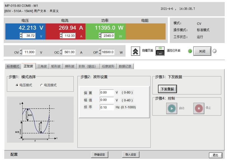 3、支持输出参数显示/设置、启/停控制、保护参数配置、状态指示函数发生器,提供了100步任意波形编辑能力。
