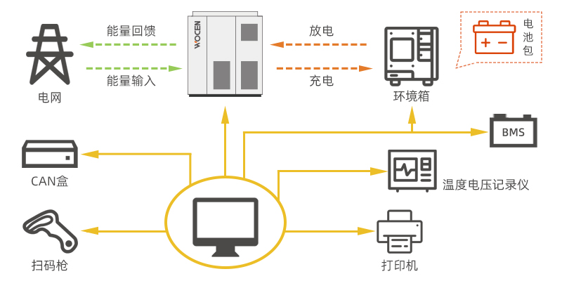 储能电池充放电测试解决方案专为储能电池充电、放电等测试而开发。针对储能电池的研发设计、试验验证、生产下线检测而设计的一套便捷的自动化测试系统。主要包含充放电测试电源、扫码枪、工控机及测试系统软件,可集成环境箱、冷水机、辅助采样通道、打印机等多种试验设备。应用于大型储能电池企业、车企、研究机构实验室等。